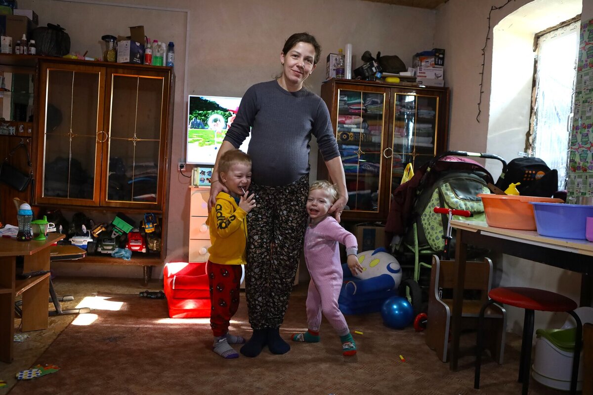 Hugging one-and-a-half-year-old Alina and three-year-old Andrey, Lilya believes in a peaceful future for them and for their little brother, who will soon be born. She is convinced that Ukrainians should be united and support those who remain near the frontline.