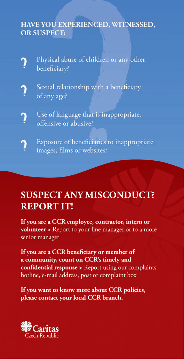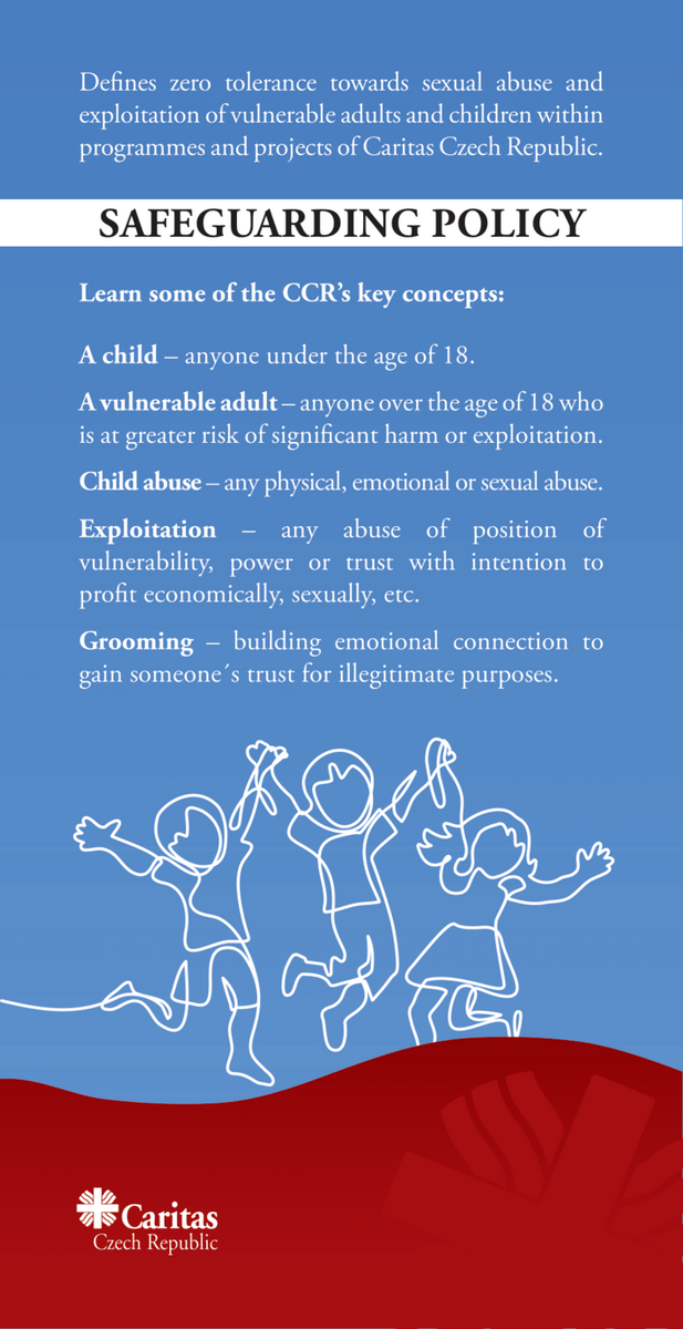 Карітас Чеської Республіки вважає захист дітей та інших учасників програм одним з найважливіших своїх зобов'язань. Наш обов'язок – зробити все можливе, щоб запобігти сексуальній експлуатації, насильству та домаганням. Спільноти, яким ми допомагаємо, – особливо діти та вразливі дорослі, – повинні знати, що вони можуть розраховувати на нашу допомогу.