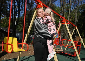 В Україні ми дбаємо також про найбільш вразливі групи населення. У західній частині країни ми допомогли побудувати інклюзивні дитячі майданчики, де всі діти можуть грати разом. Наталя, мати двох доньок з інвалідністю, вдячна за цю ініціативу. «Мої діти мають право бути щасливими, грати з іншими, розвиватися і не бути ізольованими. Завдяки вам у них тепер є таке місце», - каже Наталя.